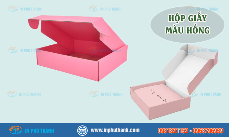 In Phú Thành là công ty chuyên thiết kế, sản xuất và in hộp giấy theo yêu cầu riêng của từng khách hàng, nhằm tạo nên sự khác biệt giúp khách hàng dễ dàng ghi nhớ hơn. Nếu có nhu cầu về in hộp giấy, đặc biệt là hộp giấy màu hồng, các bạn có thể liên hệ với chúng tôi qua hotline: 0904.932.052 – 0981.821.152